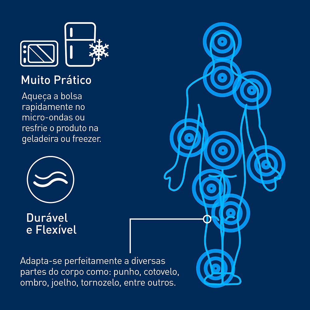 Bolsa Térmica Gel Soft, pode ser utilizada quente ou fria. Basta utilizar o congelador para resfriar ou no micro-ondas para esquentar. Ideal para alívio de dores musculares, inchaço, entorses e contusões, adapta-se perfeitamente a diversas partes do corpo como: testa, punho, cotovelo, ombro, joelho, tornozelo, entre outros. Super prático de usar!